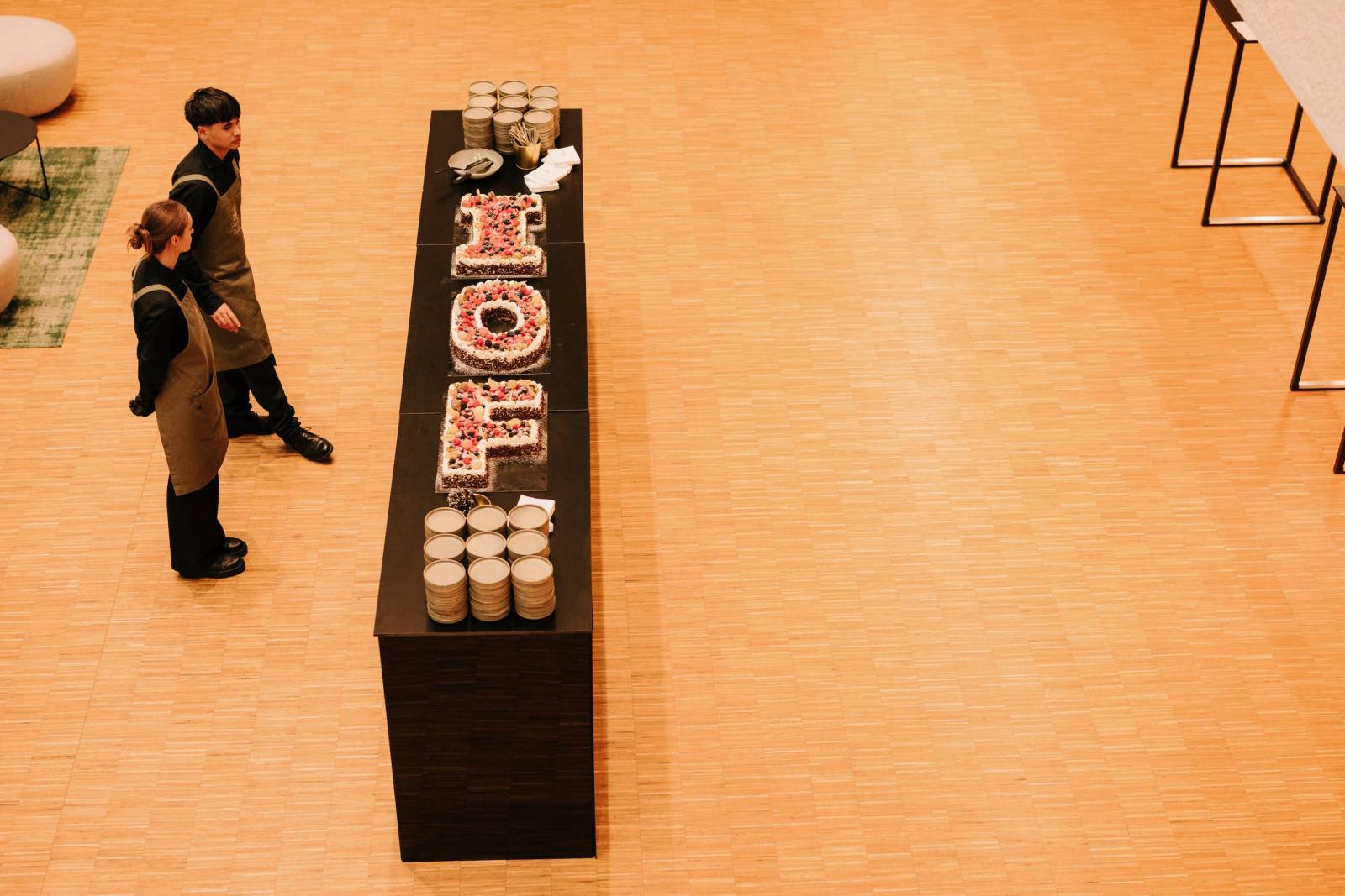 Foyer is een open, lichtrijke ruimte met een strak design, warme houten vloer en hoogwaardige afwerking. Ze bezit veel daglicht met mogelijkheid tot verduistering. De gezellige binnentuin voorzien van terrasmeubilair vormt een mooie aanvulling op deze ruimte. Aansluitend grenst er een volledig uitgeruste keuken, ideaal voor live cooking en een culinaire beleving tijdens jullie feest.